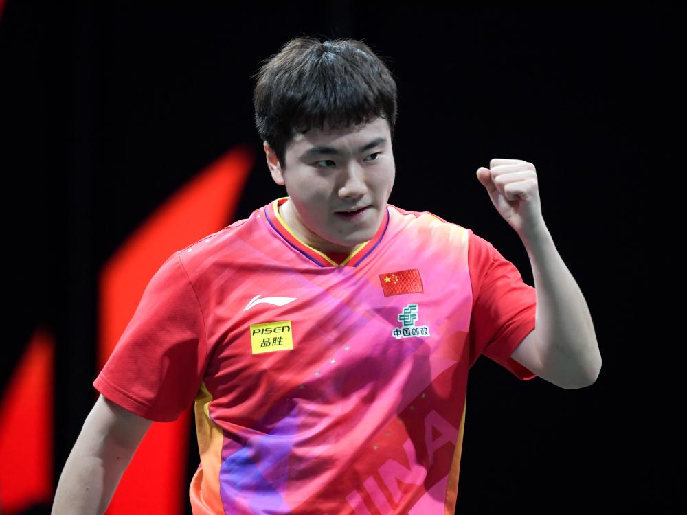 12月4日,中國隊(duì)選手梁靖崑在男單比賽中慶祝得分。新華社記者 王曦 攝