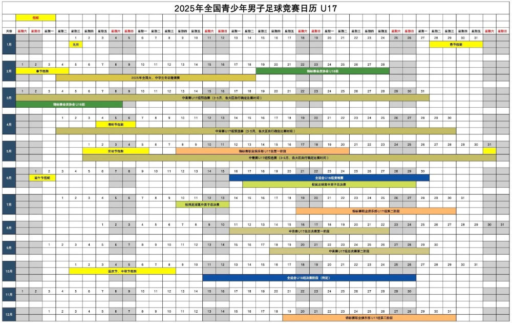 中國足協(xié)此次發(fā)布的統(tǒng)一賽歷涉及男子U13至U18共6個年齡段和女子U14至U18共5個年齡段的球員,包含中青賽、體校杯、職業(yè)俱樂部梯隊(duì)的比賽、校園足球高中男女總決賽等。不同賽事用不同顏色標(biāo)注,在表格中一目了然。中國足協(xié)青少部負(fù)責(zé)人程旭表示,這份賽歷是各部門共同推進(jìn)的結(jié)果,不僅有助于賽事統(tǒng)籌和優(yōu)化,也能更好地凝聚力量,完善人才培養(yǎng)。