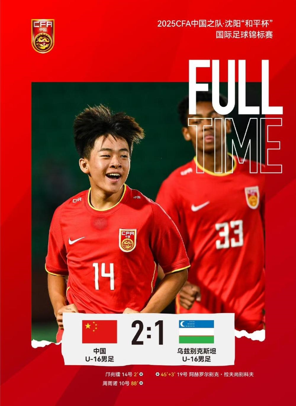 新華社沈陽(yáng)7月6日電(記者 劉藝淳)6日,2025CFA中國(guó)之隊(duì)·沈陽(yáng)“和平杯”國(guó)際足球錦標(biāo)賽次輪在沈陽(yáng)城市體育場(chǎng)舉行,憑借周雨諾最后時(shí)刻的遠(yuǎn)射破門,中國(guó)U16男足完成“準(zhǔn)絕殺”,以2:1力克烏茲別克斯坦隊(duì),保留爭(zhēng)冠希望。