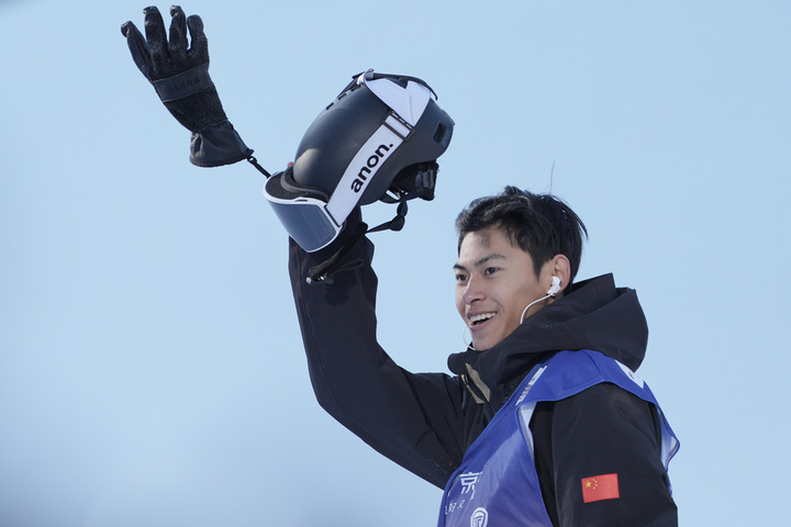11月27日,中國單板滑雪運動員蘇翊鳴在資格賽晉級后慶祝。新華社記者 盧星吉 攝