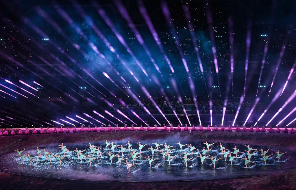 11月9日,第十五屆全國運(yùn)動(dòng)會(huì)開幕式在廣東奧林匹克體育中心舉行,圖為演員在開幕式現(xiàn)場(chǎng)表演。新華社記者 燕雁 攝