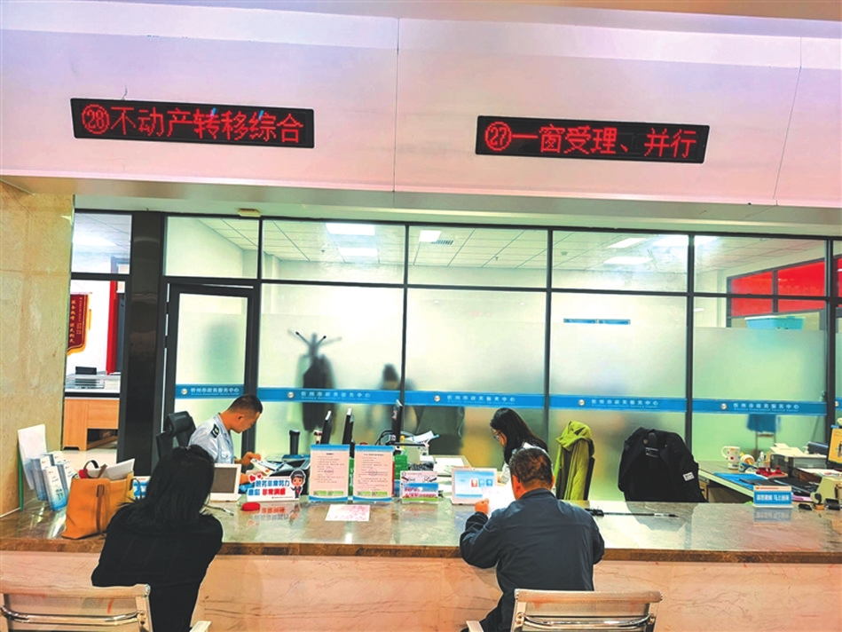 市政務大廳一樓不動產(chǎn)轉(zhuǎn)移綜合窗口,實現(xiàn)稅務+不動產(chǎn)登記一窗受理、并行辦理,日均辦理400件以上。