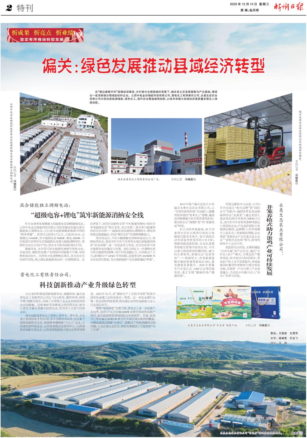 永奧生態(tài)農(nóng)業(yè)有限公司“非籠養(yǎng)”雞蛋產(chǎn)品。本報(bào)記者馮曉磊攝 在“碳達(dá)峰碳中和”戰(zhàn)略縱深推進(jìn)、鄉(xiāng)村振興全面提速的背景下,偏關(guān)縣立足資源稟賦與產(chǎn)業(yè)基礎(chǔ),涌現(xiàn)出一批深耕細(xì)分領(lǐng)域的標(biāo)桿企業(yè)。山西中電金谷儲(chǔ)能科技有限公司、晉電化工有限責(zé)任公司、永奧生態(tài)農(nóng)業(yè)有限公司分別在新能源儲(chǔ)能、綠色化工、現(xiàn)代農(nóng)業(yè)賽道破局創(chuàng)新,以技術(shù)突破為縣域經(jīng)濟(jì)高質(zhì)量發(fā)展注入強(qiáng)勁動(dòng)能。 混合儲(chǔ)能獨(dú)立調(diào)頻電站: “超級(jí)電容+鋰電”筑牢新能源消納安全線 作為全球單體規(guī)模最大的超級(jí)電容調(diào)頻儲(chǔ)能電站,山西中電金谷儲(chǔ)能科技有限公司投資建設(shè)的偏關(guān)混合儲(chǔ)能獨(dú)立調(diào)頻電站,正以技術(shù)創(chuàng)新破解新能源并網(wǎng)的“頻率難題”。該項(xiàng)目總投資6.7億元,占地25.24畝,總規(guī)模達(dá)100MW,其中超級(jí)電容58MW、鋰電42MW,不僅是國內(nèi)首例百兆瓦級(jí)超級(jí)電容混合儲(chǔ)能調(diào)頻項(xiàng)目,更擁有完全自主知識(shí)產(chǎn)權(quán),技術(shù)水平躋身國際領(lǐng)先行列。 隨著風(fēng)電、光伏等可再生能源快速替代傳統(tǒng)火電,其波動(dòng)性、隨機(jī)性加劇了電網(wǎng)短時(shí)間能量不平衡,導(dǎo)致頻率波動(dòng)加大。而傳統(tǒng)火電調(diào)頻響應(yīng)滯后,甚至存在反向調(diào)節(jié)風(fēng)險(xiǎn),難以滿足新能源場站的一次調(diào)頻需求。在此背景下,該項(xiàng)目創(chuàng)新性采用“中時(shí)能量型鋰電+短時(shí)功率型超級(jí)電容”混合系統(tǒng),充分發(fā)揮二者功率與能量特性的互補(bǔ)優(yōu)勢(shì)——超級(jí)電容快速響應(yīng)調(diào)頻指令,鋰電持續(xù)穩(wěn)定能量輸出,形成“梯次互補(bǔ)”的調(diào)頻調(diào)峰能力。 項(xiàng)目投運(yùn)后,不僅大幅緩解電網(wǎng)頻率波動(dòng)壓力、保障電網(wǎng)安全,更成為忻州市乃至?xí)x西北地區(qū)新能源消納的“安全屏障”,進(jìn)一步促進(jìn)風(fēng)力發(fā)電、光伏發(fā)電等可再生能源發(fā)電的建設(shè)與發(fā)展。按《山西電力一次調(diào)頻市場交易實(shí)施細(xì)則》測算,項(xiàng)目年收益超億元、年納稅過千萬元;新增的2個(gè)220kV并網(wǎng)間隔,還能帶動(dòng)約400MW風(fēng)光發(fā)電項(xiàng)目落地,為區(qū)域新能源產(chǎn)業(yè)發(fā)展搭建起“橋梁”。 晉電化工有限責(zé)任公司: 科技創(chuàng)新推動(dòng)產(chǎn)業(yè)升級(jí)綠色轉(zhuǎn)型 從合金材料制造到新能源發(fā)電、城鎮(zhèn)供熱,偏關(guān)縣晉電化工有限責(zé)任公司以“自主研發(fā)、循環(huán)利用、轉(zhuǎn)型升級(jí)”戰(zhàn)略為指引,實(shí)現(xiàn)了從傳統(tǒng)工業(yè)企業(yè)向綠色科技企業(yè)的跨越。這家2001年注冊(cè)成立的民營企業(yè),如今已成長為偏關(guān)縣最大民營企業(yè)、忻州市十大骨干民營企業(yè)。 技術(shù)創(chuàng)新是晉電化工的核心競爭力。多年來,企業(yè)累計(jì)獲得國家專利23項(xiàng),其中發(fā)明專利8項(xiàng),先后拿下國家高新技術(shù)企業(yè)、國家級(jí)專精特新“小巨人”企業(yè)、山西省民營科技企業(yè)、山西省省級(jí)企業(yè)技術(shù)中心、山西省技術(shù)創(chuàng)新示范企業(yè)、山西省智能制造示范企業(yè)等多項(xiàng)榮譽(yù)。2023年12月,其“鎳鐵生產(chǎn)工藝技術(shù)發(fā)明”斬獲中國有色金屬工業(yè)科學(xué)技術(shù)一等獎(jiǎng)。這一有色金屬行業(yè)唯一的全國性科技獎(jiǎng)項(xiàng),標(biāo)志著企業(yè)科技創(chuàng)新能力邁入行業(yè)頂尖水平。 圍繞“綠色轉(zhuǎn)型”發(fā)展主線,晉電化工進(jìn)一步拓展產(chǎn)業(yè)邊界,投資3.7億元實(shí)施24MW農(nóng)林生物質(zhì)熱電聯(lián)產(chǎn)項(xiàng)目,成為能源轉(zhuǎn)型領(lǐng)域國際合作的標(biāo)桿。目前,該項(xiàng)目已帶動(dòng)偏關(guān)縣城150多萬平方米區(qū)域?qū)崿F(xiàn)供熱覆蓋,支撐縣城清潔取暖“全域化”,既解決了傳統(tǒng)供暖的污染問題,又為區(qū)域生態(tài)優(yōu)先、綠色發(fā)展提供了可復(fù)制的“化工方案”。 永奧生態(tài)農(nóng)業(yè)有限公司: 非籠養(yǎng)模式助力蛋雞產(chǎn)業(yè)可持續(xù)發(fā)展 2019年落戶偏關(guān)縣窯頭鄉(xiāng)的偏關(guān)永奧生態(tài)農(nóng)業(yè)有限公司,以“非籠養(yǎng)蛋雞養(yǎng)殖”為突破口,顛覆傳統(tǒng)養(yǎng)殖的“效率至上”邏輯,建成亞洲規(guī)模最大的非籠養(yǎng)蛋雞農(nóng)場,推動(dòng)農(nóng)業(yè)從“規(guī)模擴(kuò)張”向“質(zhì)量效益”轉(zhuǎn)型。 在公司的養(yǎng)殖基地,20萬羽蛋雞生活在從歐洲引進(jìn)的立體棲架式散養(yǎng)系統(tǒng)中,每只雞的活動(dòng)空間是傳統(tǒng)籠養(yǎng)的3至5倍;物聯(lián)網(wǎng)溫濕度控制、自動(dòng)化清糞等智能化管理手段的應(yīng)用,不僅從源頭降低疾病傳播風(fēng)險(xiǎn)、減少抗生素使用,更催生出“品質(zhì)革命”——檢測顯示,其雞蛋氨基酸含量較普通雞蛋高出30%,蛋殼硬度顯著提升。2025年更集齊可生食認(rèn)證、GAP認(rèn)證等