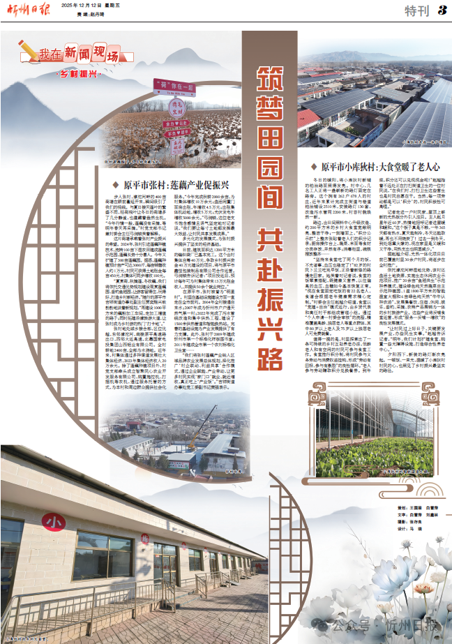 張村地處城鄉(xiāng)接合部,區(qū)位優(yōu)越,東鄰滹沱河,南接原平高速路出口,西鄰大運(yùn)高速,北靠國家電投集團(tuán)山西鋁業(yè)有限公司。全村耕地2400畝,全部為水澆地。近年來,村集體通過多種渠道發(fā)展壯大集體經(jīng)濟(jì),2023年集體經(jīng)濟(jì)收入20萬余元。除了蓮藕種植項目外,村黨支部牽頭成立智聚民心農(nóng)業(yè)開發(fā)服務(wù)有限公司,購置拖拉機(jī)、打捆機(jī)等農(nóng)機(jī),通過服務(wù)托管的方式,為本村和周邊群眾提供社會化服務(wù)。“今年完成秋耕2000余畝,為村集體增收10萬余元;盤活閑置門面房出租,年增收4.5萬元;出租集體機(jī)動地,增收5萬元;光伏發(fā)電年增收5000余元?!惫瓭欐i,這位老支書飽含感情且語氣堅定地對記者說,“我們要讓每寸土地都發(fā)揮最大效益,讓村民共享發(fā)展成果。”