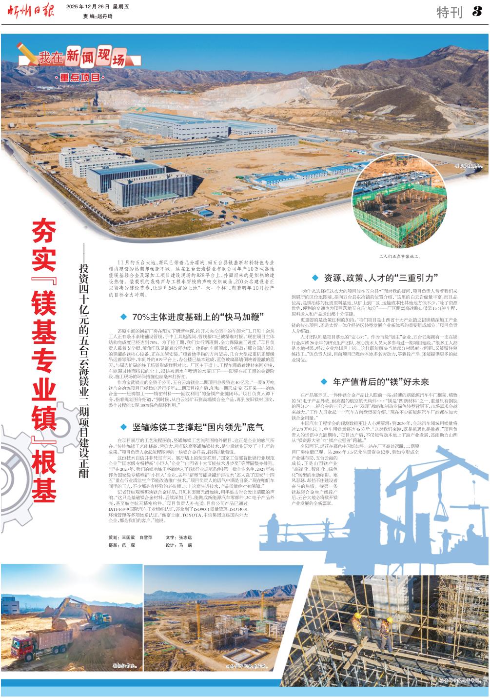 夕陽(yáng)西下,焊花在暮色中閃爍如星。站在廠區(qū)高處遠(yuǎn)眺,二期項(xiàng)目廠房輪廓已現(xiàn)。從2006年3.5億元注冊(cè)資金起步,到如今形成全產(chǎn)業(yè)鏈布局,五臺(tái)云海的成長(zhǎng),正是山西鎂產(chǎn)業(yè)“高端化、智能化、綠色化”轉(zhuǎn)型的生動(dòng)縮影。寒風(fēng)瑟瑟,卻擋不住建設(shè)者奮斗的熱情。待第一條鎂基輕合金生產(chǎn)線投產(chǎn)后,五臺(tái)大地必將掀開鎂產(chǎn)業(yè)發(fā)展的全新篇章。