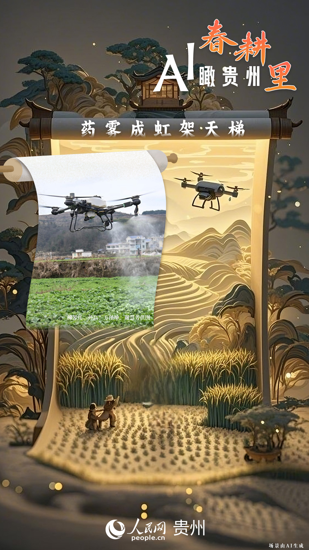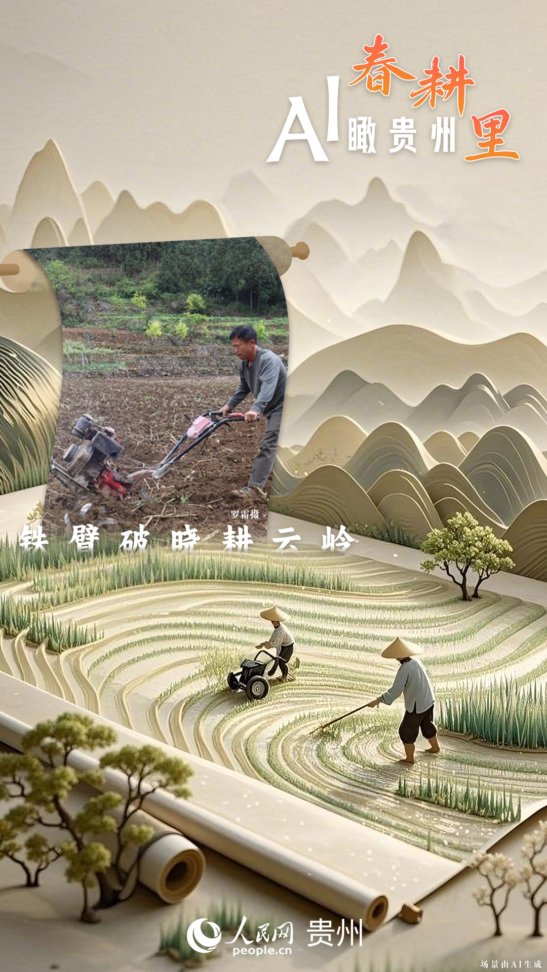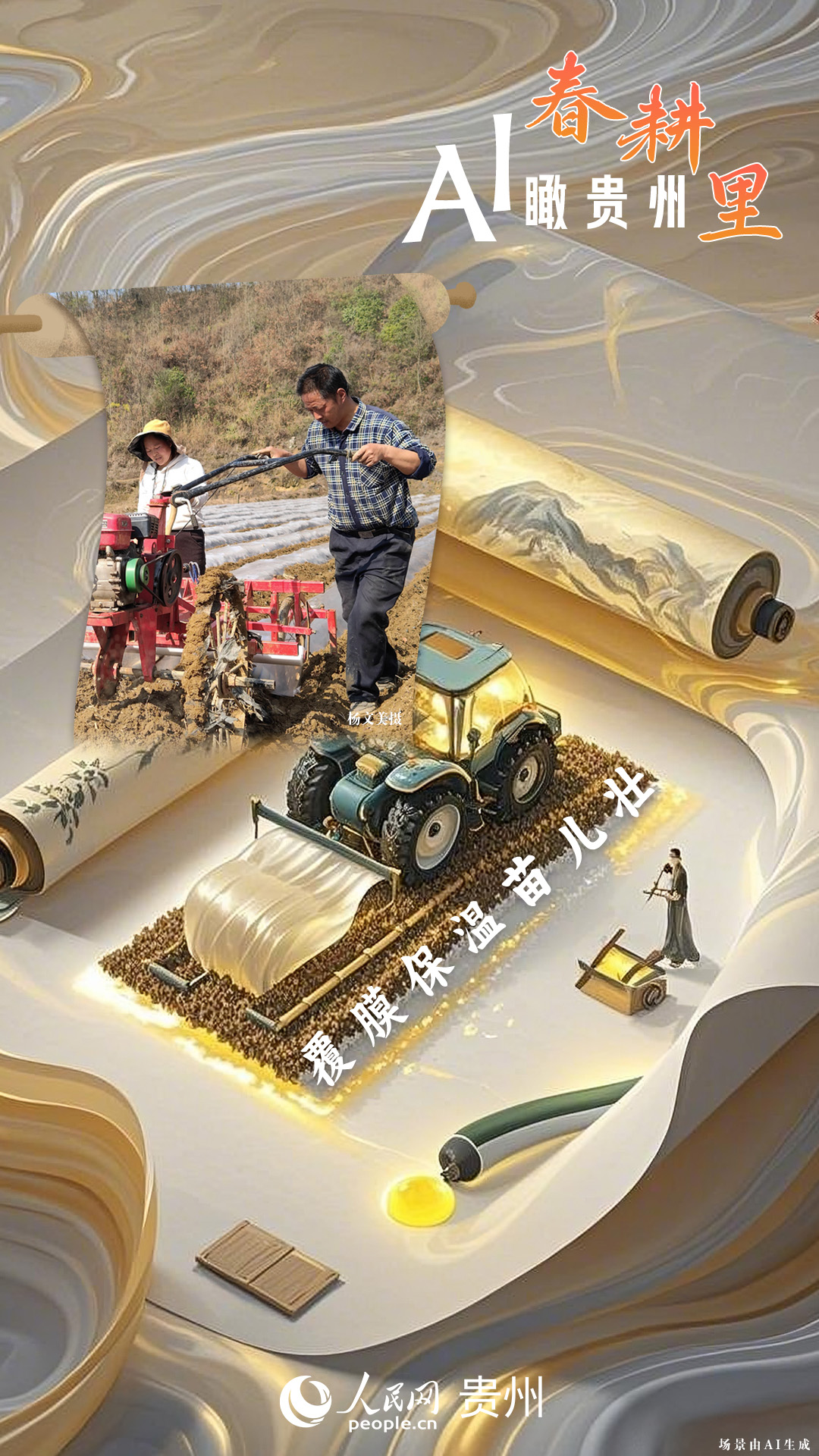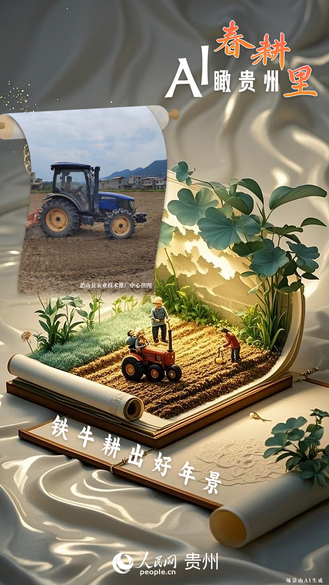春回大地,萬(wàn)物復(fù)蘇,黔地山川間正上演著一場(chǎng)生機(jī)勃勃的春耕盛景。傳統(tǒng)農(nóng)耕與現(xiàn)代科技在這里交織,描繪出一幅幅充滿希望的畫卷。 春耕不僅是農(nóng)時(shí)的序曲,更是科技與土地對(duì)話的現(xiàn)場(chǎng)。在貴州這片喀斯特地貌與民族文化交織的土地上,春耕正經(jīng)歷一場(chǎng)靜默的變革:無(wú)人機(jī)掠過千年梯田,算法解析紅壤墑情,覆膜機(jī)織就“智能外衣”,而彎腰勞作的農(nóng)人,依然用繭手傳遞著古老農(nóng)耕文明的溫度。 本期跟隨AI一起描繪貴州春耕里的故事。
