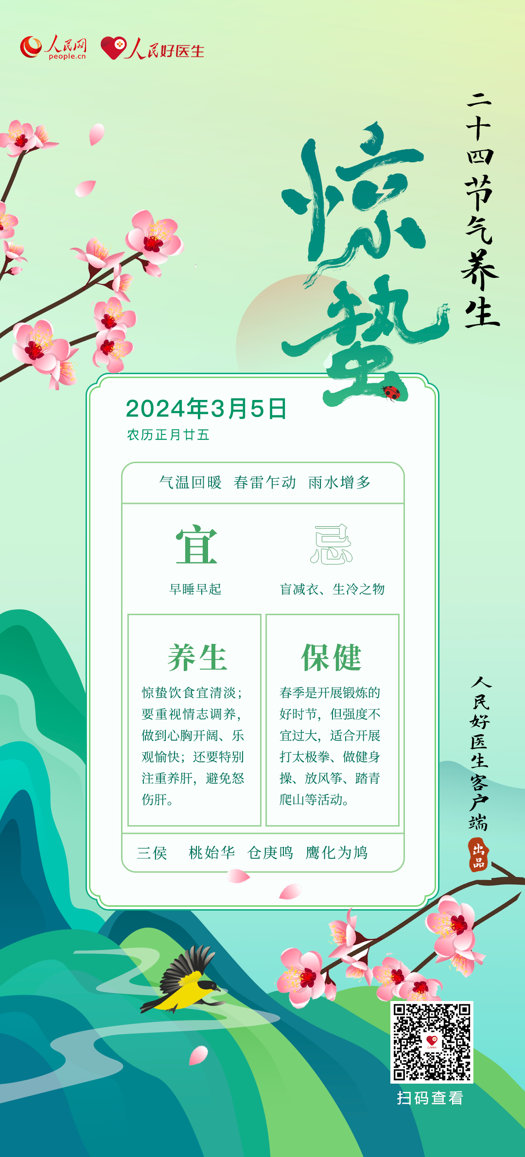 —年有四時(shí)變化,有24個(gè)節(jié)氣的更替,不同的節(jié)氣有不同的氣候,這些氣候變化與人體健康息息相關(guān)?!秱€(gè)人健康手冊(cè)(二十四節(jié)氣)》系列,是人民網(wǎng)·人民好醫(yī)生客戶端邀請(qǐng)知名中醫(yī)專(zhuān)家,根據(jù)二十四節(jié)氣的變化規(guī)律,通過(guò)防病調(diào)理、飲食養(yǎng)生、運(yùn)動(dòng)按摩等,調(diào)整人體節(jié)律,平衡陰陽(yáng),與自然界的陰陽(yáng)變化相應(yīng),從而達(dá)到健康養(yǎng)生的目的。想了解更多驚蟄養(yǎng)生知識(shí),請(qǐng)點(diǎn)擊查看《個(gè)人健康手冊(cè)(二十四節(jié)氣·驚蟄篇)》。