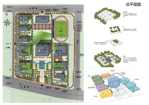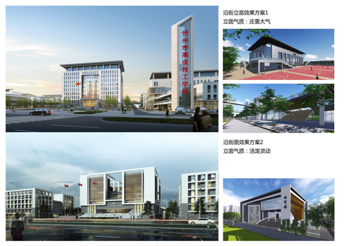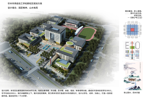 我們本著國匠精神-九宮格布局、山水格局-背山面水、四水歸堂的設(shè)計理念,團(tuán)結(jié)上學(xué)、振興技校的精神,努力將本項目打造成為忻州市的新名片,圓技校學(xué)生一個大學(xué)夢。我們注重整體空間的舒適性、藝術(shù)性,不強(qiáng)調(diào)過分統(tǒng)一。設(shè)計中注重細(xì)節(jié)處理和學(xué)生們行為模式的考慮;將環(huán)境氣氛和設(shè)施布置的更具有靈活性、親和力,適應(yīng)寬松、生活化的教學(xué)模式。