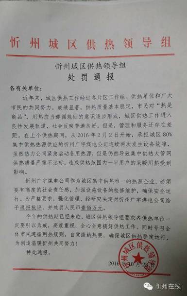 在上個供熱期間,從2016年2月2日開始,承擔城區(qū)80%集中供熱熱源供應的忻州廣宇煤電公司連續(xù)兩次發(fā)生設備故障,雖然熱力公司緊急啟動備用熱源,但是仍然導致集中供熱大管網(wǎng)供熱質量嚴重不達標,造成供熱范圍內(nèi)一半用戶的采暖用熱受到影響。為嚴格要求,強化管理,經(jīng)城區(qū)供熱領導組研究,決定對忻州廣宇煤電公司給予通報批評,并處罰金人民幣壹佰萬元。城區(qū)供熱領導組指出,忻州廣宇煤電公司作為城區(qū)集中供熱唯一的熱源企業(yè),必須要有高度的社會責任感,加強設施設備的檢修維護,確保安全運行。