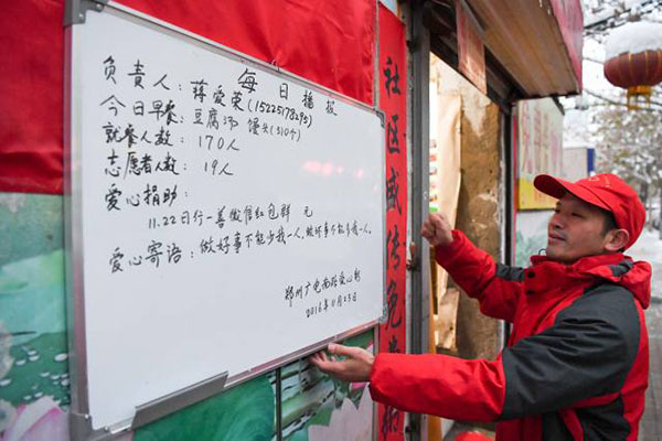 圖說:志愿者在懸掛“每日播報”,將早餐內容、就餐人數(shù)等信息公布在愛心粥屋門口(11月23日攝)。圖片來源:新華社