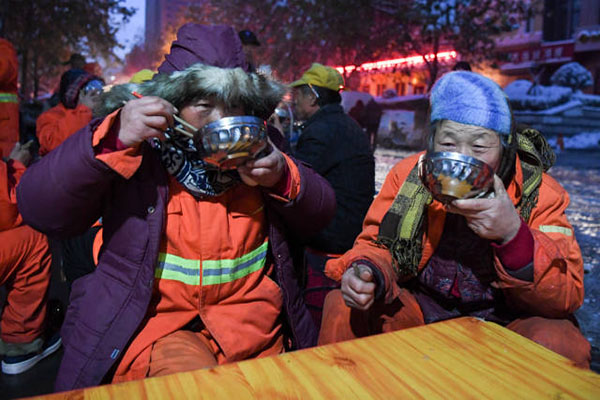 百度貼吧網友“馬克斯基”說:“下雪天路過鄭州廣電南路愛心粥屋,寒風中200多位環(huán)衛(wèi)工人圍坐在一起喝著熱騰騰的粥,有說有笑,我流淚了。此刻,愛心粥屋就是我們‘城市美容師’的家。”