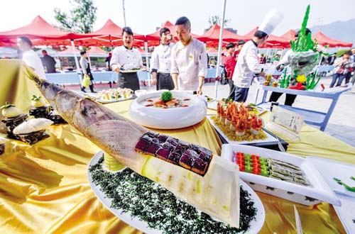 竹筍是杭州市臨安區(qū)的經(jīng)濟主產(chǎn)業(yè),被稱為臨安農(nóng)民的第一棵“搖錢樹”。“百筍宴”是臨安傳統(tǒng)的特色名宴,被認定為“中華特色名宴”,其包含的與竹筍有關(guān)的數(shù)百道筍菜佳肴,凝聚著濃厚的吳越美食文化。這是“百筍宴”活動現(xiàn)場展示的與筍有關(guān)的特色菜肴據(jù)新華社 記者 徐 昱 攝