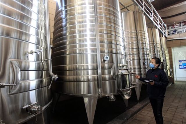在寧夏永寧縣閩寧鎮(zhèn)立蘭酒莊,劉莉在檢查紅酒發(fā)酵罐的溫度(2017年12月22日攝)。新華社記者 隋先凱 攝