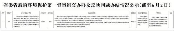 截止2017年6月3日10時(shí),省委省政府環(huán)境保護(hù)第一督察組向我市交辦群眾反映問題六批,共計(jì)33件。其中,按重要性劃分,重點(diǎn)群眾反映問題11件、一般群眾反映問題22件;按區(qū)域分,忻府區(qū)14件、開發(fā)區(qū)1件、原平市3件、保德縣3件、寧武縣1件、五臺(tái)縣1件、河曲縣1件、定襄縣3件、岢嵐縣1件、代縣2件、靜樂1件、神池1件、市住建局1件;按污染類型分,大氣20件、水8件、垃圾6件、固廢1件、噪聲8件、生態(tài)3件、光1件、其他3件。目前已辦結(jié)第一批(1件)群眾反映問題,對(duì)3名相關(guān)責(zé)任人進(jìn)行了約談,對(duì)1名相關(guān)責(zé)任人進(jìn)行了黨紀(jì)政紀(jì)處分。