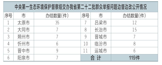 中央第一生態(tài)環(huán)境保護(hù)督察組交辦我省第二十二批群眾舉報問題119件,辦結(jié)119件。公示119件,其中太原市35件、大同市7件、朔州市7件、忻州市6件、晉中市9件、陽泉市7件、呂梁市12件、長治市15件、晉城市7件、臨汾市8件、運城市6件。可登錄山西省人民政府網(wǎng)站或掃描二維碼查閱群眾信訪舉報轉(zhuǎn)辦和邊督邊改公開情況一覽表。