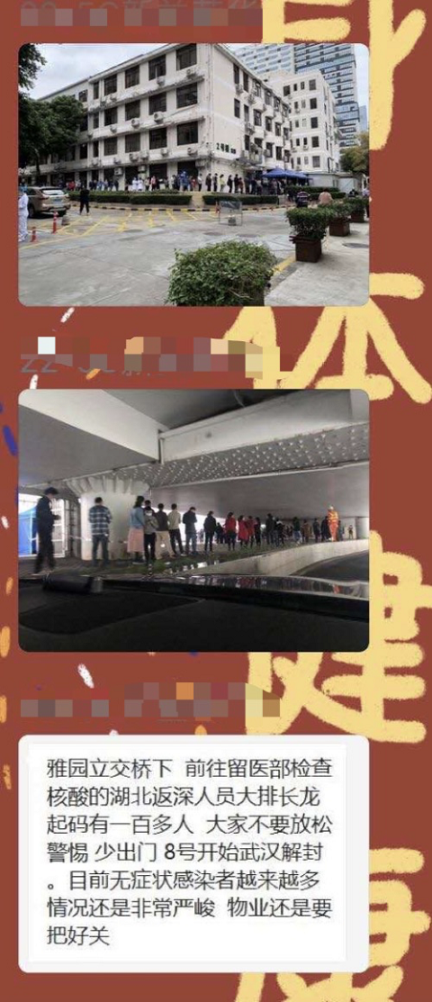 “雅園立交橋下,前往留醫(yī)部檢查核酸的湖北返深人員大排長龍,起碼有一百人,大家不要放松警惕,少出門。”7日,這段文字和兩張大排長龍的圖片在網(wǎng)上流傳。記者9日從深圳市人民醫(yī)院獲悉,該情況并不屬實。一份核酸取樣平均時間為數(shù)秒鐘,醫(yī)院核酸檢測排隊患者一般在10~50人之間,因為需要保持1米隔離,隊伍會比較長,但也未超過百米,更不存在排出醫(yī)院大門外或雅園立交橋下,市民無需緊張。