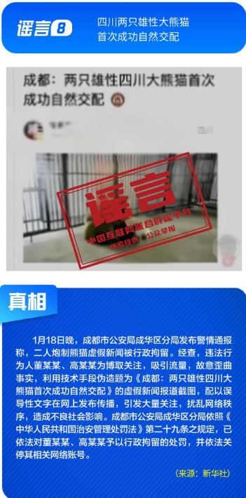 ??針對各類網(wǎng)絡(luò)謠言與亂象,多部門開展協(xié)同治理,聯(lián)動整治。1月16日,中央網(wǎng)信辦召開全國網(wǎng)絡(luò)辟謠聯(lián)動機制第三次全體會議,部署以辟謠工作新成效助力清朗網(wǎng)絡(luò)空間建設(shè)。中央網(wǎng)信辦聯(lián)合工業(yè)和信息化部等部門持續(xù)整治汽車行業(yè)網(wǎng)絡(luò)亂象,處置一批涉嫌挑動對立、炒作負面話題、違規(guī)測評的賬號;國家廣播電視總局開展“AI魔改”視頻專項治理,各平臺處置大量違規(guī)內(nèi)容。各地網(wǎng)信部門積極行動,陜西西安深入開展房地產(chǎn)領(lǐng)域網(wǎng)絡(luò)專項行動,處置散布樓市謠言的房產(chǎn)中介賬號,四川成都依法處置30余個惡意關(guān)聯(lián)地域、污名化城市的違規(guī)賬號。公安機關(guān)依法打擊造謠傳謠人員。擺拍“小女孩在學校跳蚤市場用50元淘到名酒”、利用AI偽造“假救護車非法轉(zhuǎn)運”、編造“兩只雄性四川大熊貓首次成功自然交配”等謠言的相關(guān)責任人已依法被予以行政處罰。