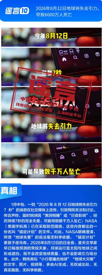 ??健康與科普領(lǐng)域謠言違背客觀規(guī)律。“人血白蛋白是‘增加免疫力’的法寶”刻意夸大該處方藥的臨床用途,忽略其特定醫(yī)療場景與使用風險;所謂“大棚草莓、冷庫葡萄、進口車厘子、染色砂糖橘是冬天水果界四大毒王”謠言片面解讀農(nóng)產(chǎn)品種植與保鮮方式,缺乏科學依據(jù);“四川兩只雄性大熊貓首次成功自然交配”純屬為吸引流量而捏造的獵奇內(nèi)容,其視頻畫面為AI生成;“2026年8月12日地球?qū)⑹ヒ?,導?000萬人死亡”更是無中生有的荒謬謠言。