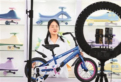 河北省邢臺(tái)市廣宗縣鐵牛自行車業(yè)有限公司的工作人員日前通過(guò)線上廣交會(huì)直播推介童車產(chǎn)品。王 壘攝(人民圖片)