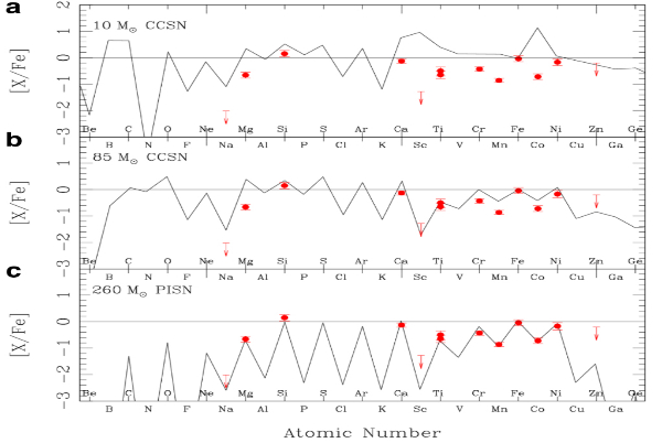 此項(xiàng)研究中,團(tuán)隊(duì)結(jié)合郭守敬望遠(yuǎn)鏡低分辨率光譜和日本昴星團(tuán)望遠(yuǎn)鏡高分辨率光譜數(shù)據(jù)發(fā)現(xiàn)了一顆化學(xué)豐度極為特殊的極貧金屬星(LAMOST J1010+2358),這顆恒星的化學(xué)豐度特征無(wú)法通過(guò)核坍縮超新星理論模型解釋,卻與260倍太陽(yáng)質(zhì)量的對(duì)不穩(wěn)定超新星理論計(jì)算結(jié)果高度吻合。