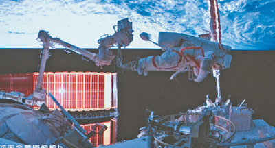 航天員蔡旭哲在空間站組合體艙外工作的畫面。