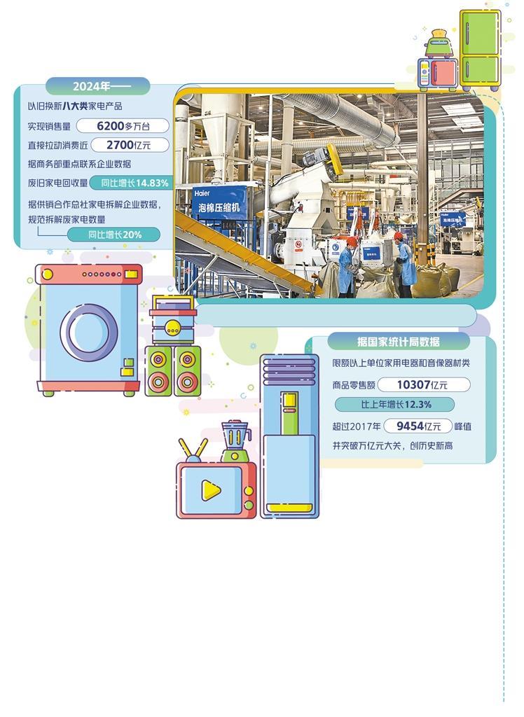 自《推動(dòng)大規(guī)模設(shè)備更新和消費(fèi)品以舊換新行動(dòng)方案》(以下簡(jiǎn)稱《行動(dòng)方案》)實(shí)施以來(lái),家電市場(chǎng)消費(fèi)潛力得到顯著釋放。數(shù)據(jù)顯示,2024年,中央加力支持以舊換新八大類(lèi)家電產(chǎn)品實(shí)現(xiàn)銷(xiāo)售量6200多萬(wàn)臺(tái),直接拉動(dòng)消費(fèi)近2700億元。日前,國(guó)家發(fā)展改革委副主任趙辰昕在國(guó)務(wù)院政策例行吹風(fēng)會(huì)上介紹,2025年將延續(xù)并加力擴(kuò)圍實(shí)施“兩新”政策,享受以舊換新補(bǔ)貼的家電產(chǎn)品種類(lèi)由2024年的8類(lèi)增至12類(lèi),單件最高補(bǔ)貼可達(dá)銷(xiāo)售價(jià)格的20%。