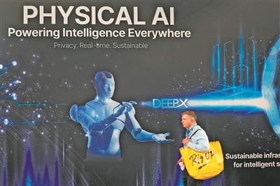 從制造業(yè)到醫(yī)療,從交通到家庭服務,物理AI正以前所未有的深度融入并賦能各行各業(yè)。圖為一名男子在2026年美國拉斯維加斯消費電子展上走過印有物理AI字樣的展臺。新華社發(fā)(曾慧攝)