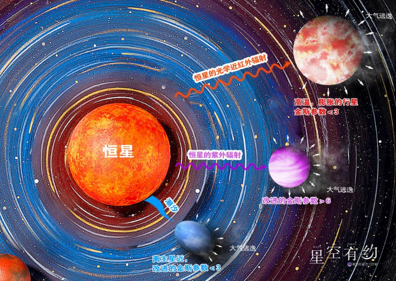 研究發(fā)現(xiàn),低質量系外行星的流體大氣逃逸可以由行星內能、恒星潮汐力拉拽或恒星的極端紫外輻射加熱單獨或共同驅動。在該項研究之前,研究人員需要依賴復雜的模型來判斷一顆行星上的流體逃逸究竟是由哪種物理機制驅動,且得到的最終結論往往并不明確。借助郭建恒主導的這項研究成果,僅使用恒星和行星的基本物理參數(shù),如質量、半徑和軌道距離等就可對低質量行星流體大氣逃逸機制做出分類。