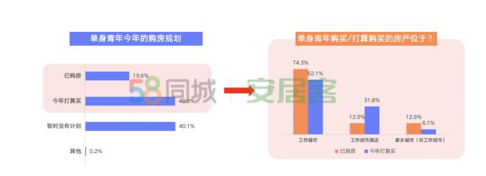 報(bào)告顯示,單身人群中有19.6%的人表示目前已購(gòu)房。他們之中,選擇在工作城市買(mǎi)房的單身青年占比74.3%,在工作城市周邊買(mǎi)房的人群占比12.9%,另有12.8%的已購(gòu)房單身青年回到家鄉(xiāng)城市(非工作城市)買(mǎi)房。