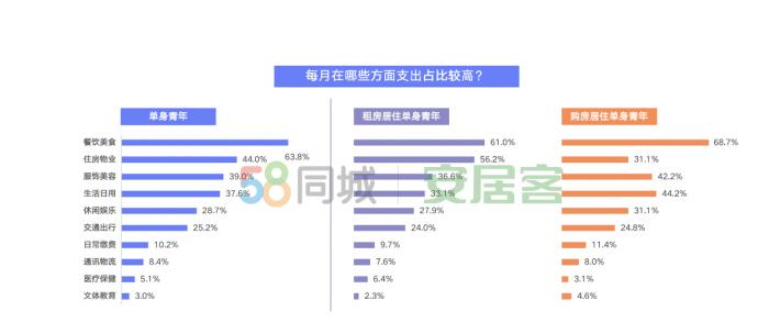 吃,是一大生活樂(lè)趣來(lái)源。報(bào)告顯示,63.8%的單身青年表示每月在餐飲美食上的花銷(xiāo)占比較高。此外,住房物業(yè)、服飾美容、生活日用等方面也是單身青年的主要開(kāi)銷(xiāo)。