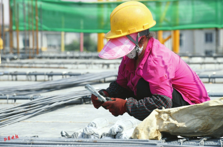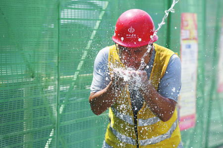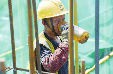 當(dāng)日,是入伏第一天,意味著開(kāi)始進(jìn)入一年中最熱的時(shí)候。在熱火朝天的施工現(xiàn)場(chǎng),工人師傅們埋頭苦干,他們雖然戴著自制遮陽(yáng)帽、冰袖,身旁放著水壺,但一小會(huì)兒工夫就會(huì)汗流浹背?!斑@樣的杯子,我每天要喝好幾杯水。”天氣太熱,來(lái)自四川樂(lè)山的林英把杯子里的水一飲而盡。黝黑的皮膚、如雨的汗水、潮濕的后背……當(dāng)大多數(shù)人避暑納涼時(shí),不少勞動(dòng)者卻辛勤地?fù)]灑著汗水,堅(jiān)守在施工一線。在這個(gè)工地上,有很多和林英一樣的打工人,他們來(lái)自全國(guó)各地,用青春和汗水建設(shè)美麗山西。