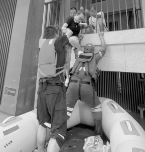 這是白龍華第一次參加洪澇災害的救援,她被隊員們的勁頭感動?!八虑闆r復雜,不可控的因素太多,各種雜物堆積,橡皮艇被淹沒在水中的彩鋼板劃破,但無論遇到什么情況,隊員們都沖鋒在前,安全轉移受困者。”白龍華說。