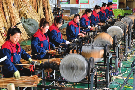 員工在編織蒲草坐墊,趕制訂單。