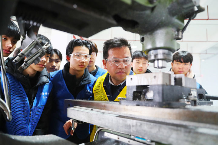 2024年1月9日,在湖南省永州市新田縣產(chǎn)業(yè)開發(fā)區(qū)永州群翰科技有限公司車間,新田縣職業(yè)中等專業(yè)學校學生在工廠師傅的指導(dǎo)下學習機床操作技術(shù)。近年來,該校聯(lián)合企業(yè)開展“產(chǎn)教融合、校企辦學”模式,助推就業(yè)創(chuàng)業(yè)。新華社發(fā)(劉貴雄 攝)
