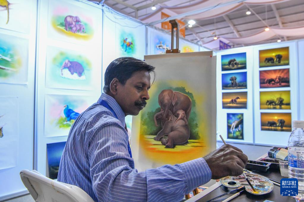 7月26日,斯里蘭卡參展商在南亞館現(xiàn)場(chǎng)作畫(huà)。