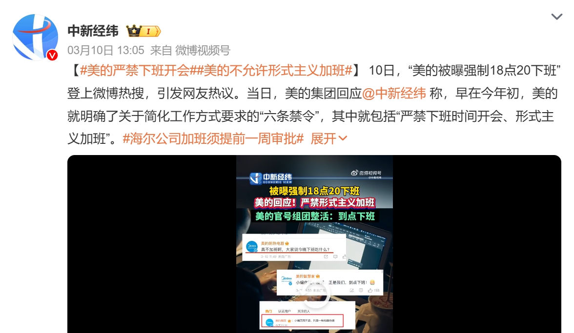 美的回應(yīng)媒體時(shí)表示,今年以來,美的明確了關(guān)于簡(jiǎn)化工作方式要求的“六條禁令”,其中就包括“嚴(yán)禁下班時(shí)間開會(huì)、形式主義加班”。