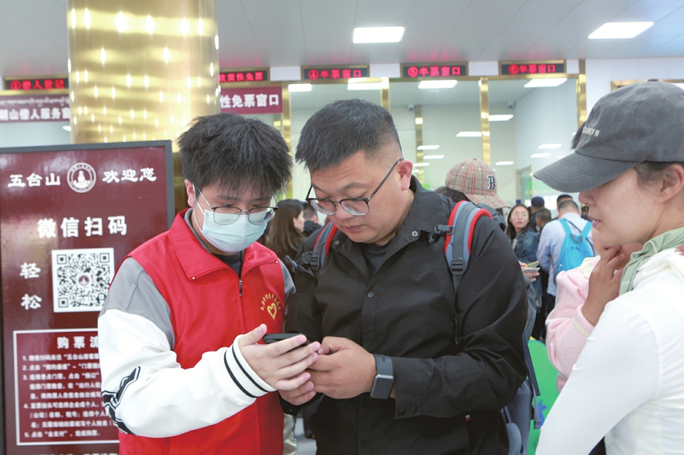 五臺(tái)山游客服務(wù)中心大廳內(nèi),志愿者正在協(xié)助游客網(wǎng)上購票。李春澤攝