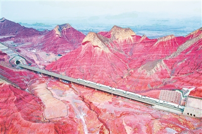 圖為1月18日,一列動車組列車行駛在蘭州市境內的丹霞地貌群中。