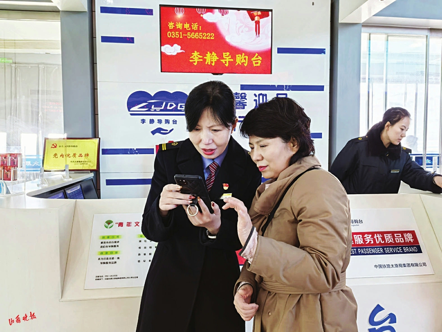 自助售取票區(qū),幾名放假回家的大學(xué)生圍著自助機(jī)手足無措,原來是誤買了車次,急需退票重買,卻不熟悉機(jī)器操作流程。李靜快步上前,手把手指導(dǎo)他們使用12306的免費(fèi)退改功能,一邊協(xié)助查詢余票、快速完成改簽,一邊不忘提醒學(xué)生們錯(cuò)峰出行,保管好隨身的證件和行李?!敖衲甏哼\(yùn)又推出了不少便民舉措,30分鐘內(nèi)免費(fèi)退改、老年人優(yōu)先購票、靜音車廂范圍擴(kuò)大,我們的工作就是把這些好政策講清楚、落到位,讓每一位旅客都旅途順暢?!崩铎o一邊幫學(xué)生操作機(jī)器,一邊對(duì)身旁的山西晚報(bào)·山河+記者說。