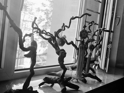 見到牛鳴遠(yuǎn)時(shí),他正忙著在家中的陽臺上懸掛兩個(gè)大樹枝?!斑@是棗樹枝,還有點(diǎn)濕,得掛起來晾干后才能再進(jìn)行加工。”牛鳴遠(yuǎn)說,朋友收拾平遙老家的房子時(shí),砍了院子里的大棗樹,知道他喜歡根雕,就專門運(yùn)回來一些送給他。