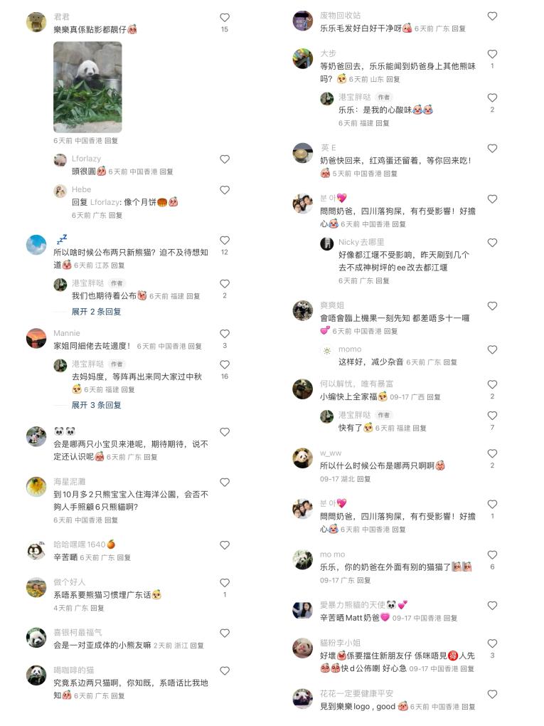 可愛的國寶牽動眾多“熊貓迷”的心,隨著贈港大熊貓消息的更新,網(wǎng)友們熱議的話題從“新熊貓是誰”“新熊貓何時能看到”,變成了“等‘奶爸’回去,樂樂能聞到‘奶爸’身上其他熊味嗎”“照顧6只熊貓人手夠嗎”“給新熊貓起什么新名字”……