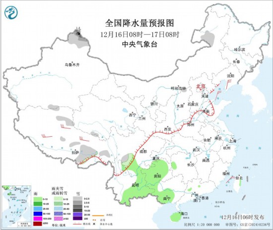 12月16日08時至17日08時,內蒙古東北部、新疆北疆北部、西藏東部和北部、川西高原南部等地部分地區(qū)有小到中雪或雨夾雪,其中,新疆北疆北部局地有大到暴雪(10~14毫米)。西南地區(qū)東南部、廣西西部和南部、海南島、臺灣島東部等地部分地區(qū)有小雨。遼東半島、西藏中北部等地部分地區(qū)有5~6級風;巴士海峽、南海東北部和中東部海域將有6~7級大風、陣風8級。