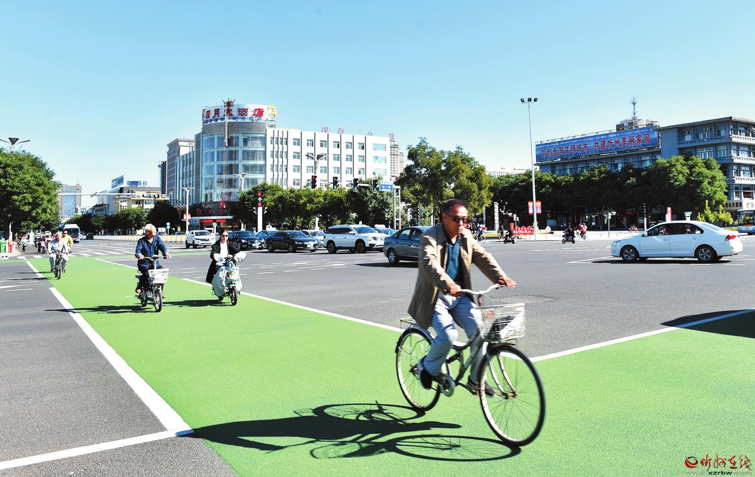 9月3日,市民在忻州城區(qū)七一路與長(zhǎng)征街交叉路口的自行車專用道上騎行。日前,忻州路面上出現(xiàn)人車分離“斑馬線”,行人走斑馬線、騎行則走專用自行車道,很好地實(shí)現(xiàn)了人和非機(jī)動(dòng)車分流通過,為創(chuàng)建文明城市增色。 宮清華 攝