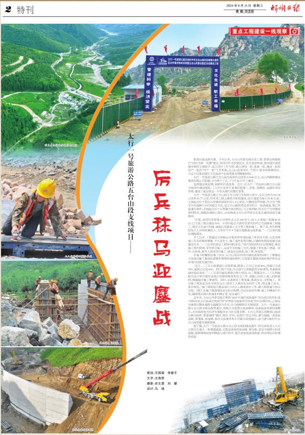 搶抓建設黃金期,刷新項目進度條。近日,在太行一號旅游公路五臺山段支線項目建設現(xiàn)場,工人們正有條不紊地加緊施工,挖機、裝載機、運輸車來回穿梭,建設工地呈現(xiàn)出一片熱火朝天的繁忙景象。