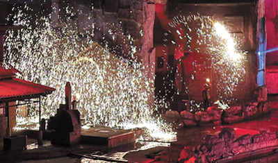 大年初七,晚上7點(diǎn),山西省晉城市司徒小鎮(zhèn)的山水實(shí)景劇《千年鐵魂》準(zhǔn)時(shí)開(kāi)演。當(dāng)臺(tái)上的幾位工匠將金黃色的鐵水一齊拋灑向天空,絢爛的鐵花在空中綻放,氣勢(shì)磅礴。觀眾的情緒也在此刻到達(dá)頂峰。