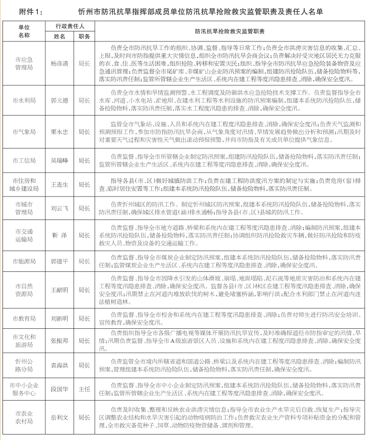 1.忻州市防汛抗旱指揮部成員單位防汛抗旱搶險(xiǎn)救災(zāi)監(jiān)管職責(zé)及責(zé)任人名單