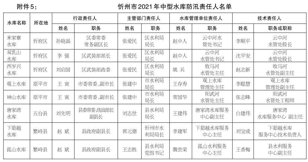 5.忻州市2021年中型水庫防汛責(zé)任人名單