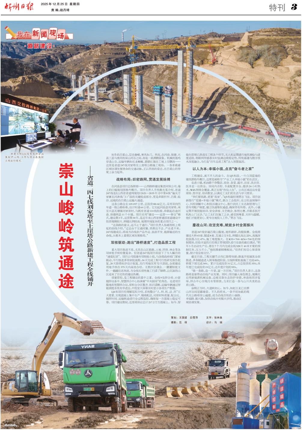 初冬的呂梁山,層巒疊嶂,寒風(fēng)如刀。然而,在河曲、保德、興縣三縣與黃河的深山河谷之間,卻是一派沸騰景象。機(jī)械的轟鳴穿透山谷,運(yùn)輸車輛如長(zhǎng)龍蜿蜒,獵獵紅旗在工地上空飄揚(yáng)——這里是省道247線劉家塔至土崖塔公路施工現(xiàn)場(chǎng)。一條承載著區(qū)域協(xié)調(diào)發(fā)展使命的交通動(dòng)脈,正以昂揚(yáng)的姿態(tài),在呂梁山的脊梁上奮力延伸。