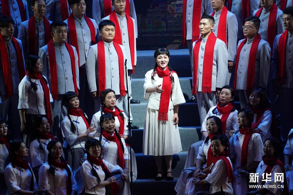 6月30日,在山西大劇院,演員在合唱《國際歌》。當(dāng)日,山西省慶祝中國共產(chǎn)黨成立100周年文藝匯演在山西省太原市山西大劇院舉行。新華社記者 詹彥 攝