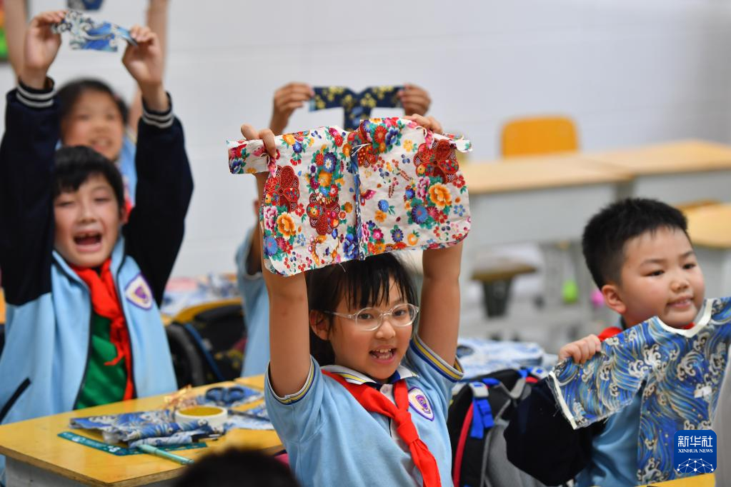 5月15日,在長沙市天心區(qū)紅衛(wèi)小學,學生在傳統(tǒng)服飾設(shè)計課上展示作品。